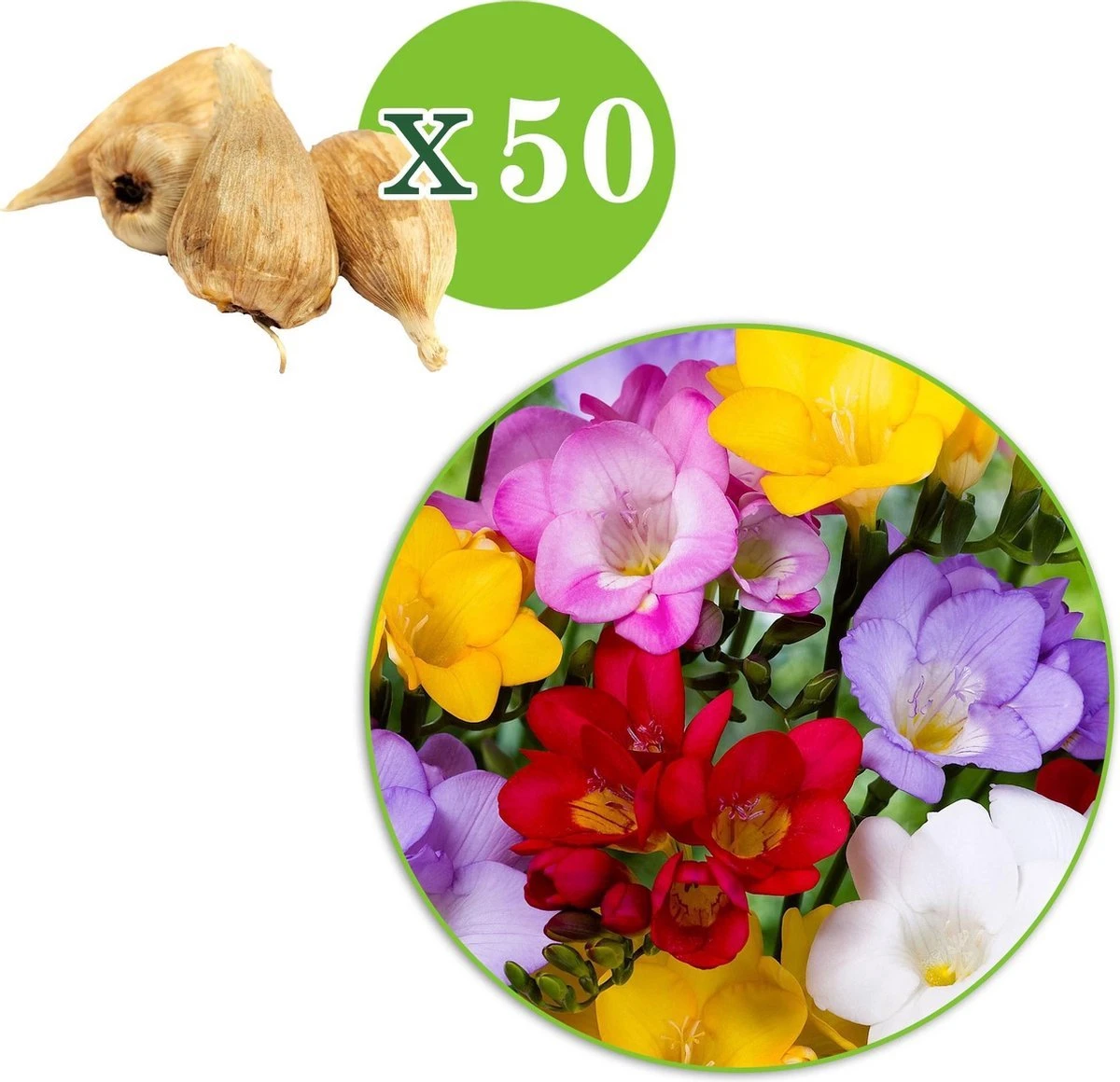 Een mooie mix. De bloemen van de fresia hebben alle kleuren van de regenboog. Ze staan leuk in de tuin, maar doen het ook prachtig in een pot op het balkon. We planten de bollen in het voorjaar. De bloemen bloeien in de zomer.