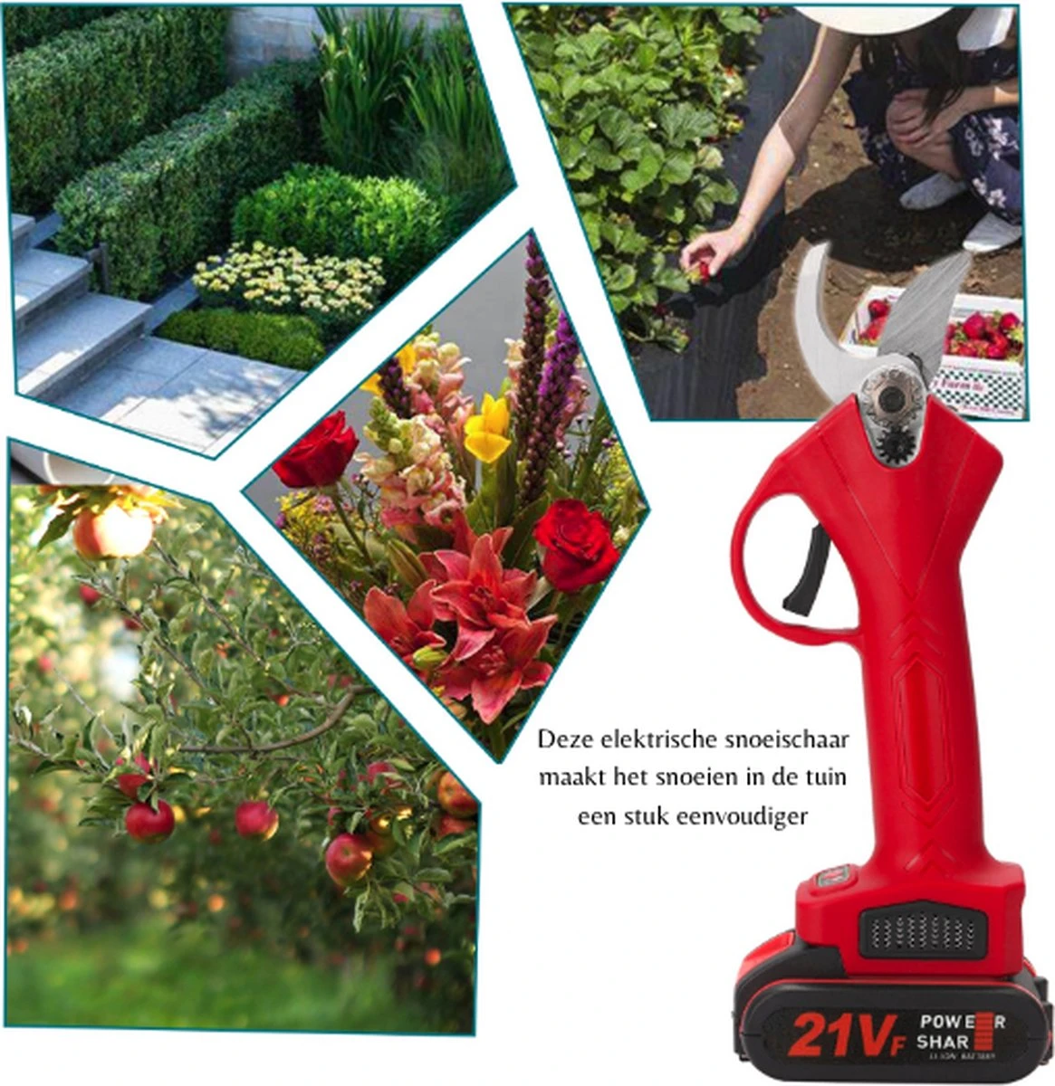 Vind jij het heerlijk om in de tuin te werken en alles seizoensklaar te snoeien? Dit is een elektrische snoeischaar; lichtgewicht en vooral makkelijk in gebruik. Ontworpen voor snijden of trimmen of minder takken in bijv fruit boomgaarden, wijngaarden, of gewoon in de tuin! Hij heeft daardoor de accu wel 8-10 keer de efficiëntie van traditionele handmatige snoeiers. Snoeien kwaliteit aanzienlijk hoger in vergelijking met handmatige snoeiers. Daarnaast wordt er een extra accu bij het koffertje geleverd zodat je na 3-4 uur niet hoeft te stoppen.