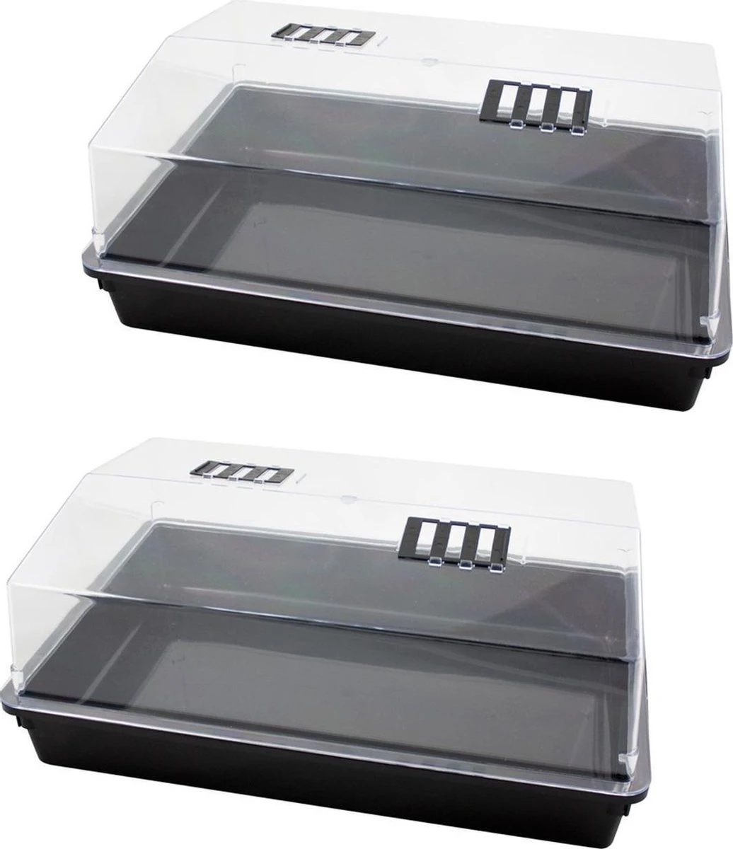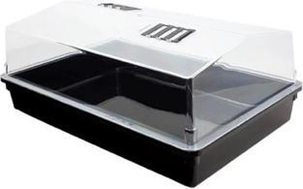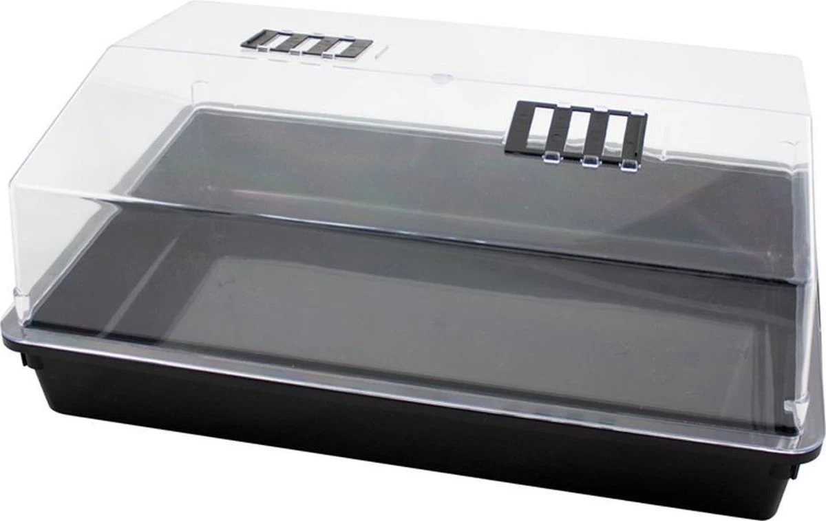 Grote kweekbak/kweekkast van kunststof met deksel 24 x 59 x 39 cm. Wordt geleverd zonder trays/kweekpotjes/turfpotjes. Grote kweekbak/kweekkastje met deksel om zaden van bijvoorbeeld kruiden of groente in te planten en te laten ontkiemen tijdens de koudere maanden. De deksel bevat ventilatieopeningen voor een optimale regeling van de temperatuur en vochtigheidsgraad. Vul de bak met aarde, leg de zaden erop, duw ze in de aarde en zet ze binnen op een lichte plaats (bijvoorbeeld in de vensterbank). Zodra het plantje ca. 6 cm hoog is kunt u deze, mits het niet meer vriest, overplanten in de tuin of in een buitenpot plaatsen. Propagators voor de vensterbank, keuken, tuin en moestuin.