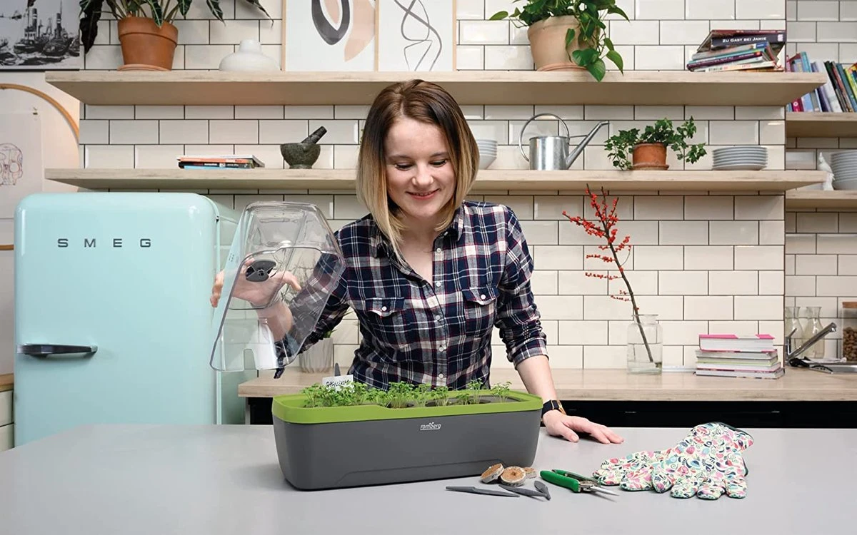 - De grote design-georiënteerde kweekbox kan overal worden neergezet waar kiemen en stekers voldoende licht krijgen maar tegelijkertijd tegen de zon beschermd zijn