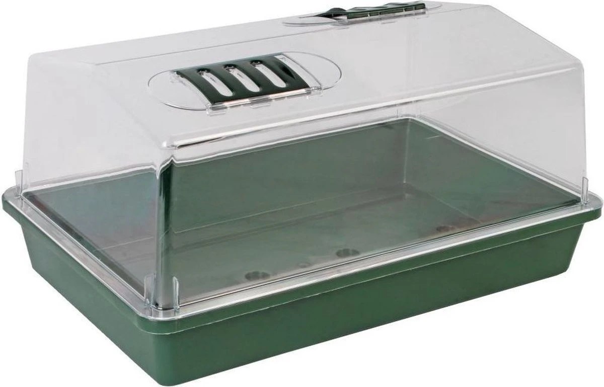 Kweekbak/kweekkast met deksel 38 x 24 x 18 cm. Kweekbak/kweekkastje met deksel om zaden van bijvoorbeeld kruiden of groente in te planten en te laten ontkiemen. De deksel bevat ventilatieopeningen voor een optimale regeling van de temperatuur en vochtigheidsgraad. Vul de bak met aarde, leg de zaden erop, duw ze in de aarde en zet ze binnen op een lichte plaats (bijvoorbeeld in de vensterbank). Zodra het plantje ca. 6 cm hoog is kunt u deze, mits het niet meer vriest, overplanten in de tuin of in een buitenpot plaatsen. Kweekkastjes/kweekbakken voor de vensterbank, keuken, tuin en moestuin. Aantal kweekbakken: 1x stuks. Materiaal: kunststof. Tuinieren – Moestuintjes – Moestuin onderhouden – Stekjes kweken – Groente en fruit kweken.