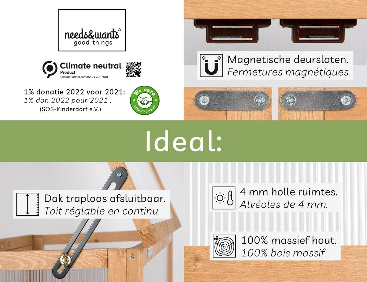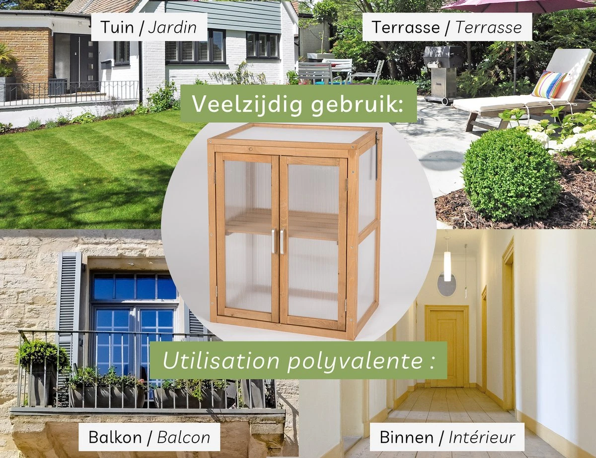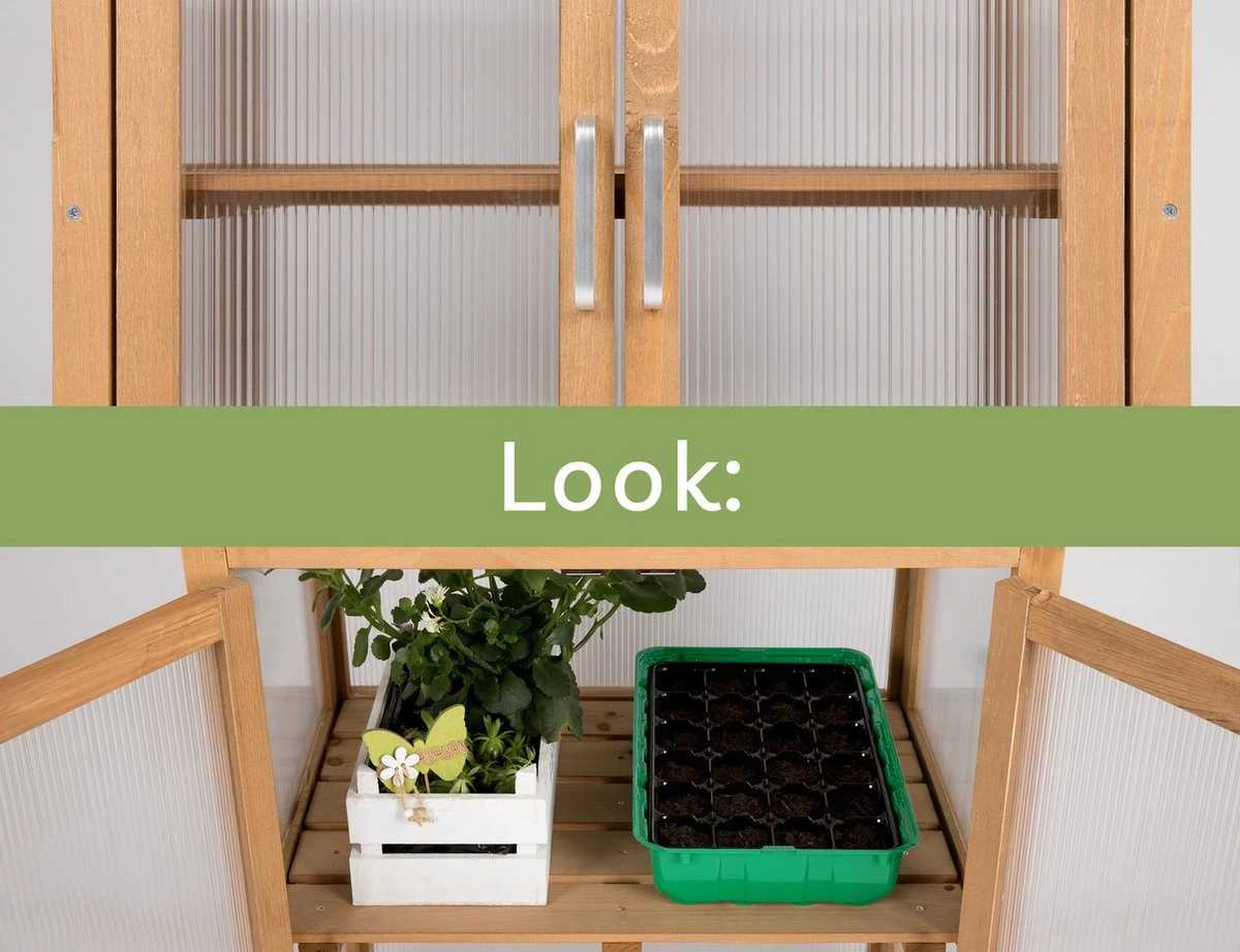 U kunt me buiten plaatsen of binnen in een kamer om uw planten te laten groeien. Mijn holle kamerpanelen zorgen voor een optimale lichtinval, mijn stevig houten kasframe is weerbestendig. U kunt mijn tussenvloer flexibel verwijderen om planten hoger te laten groeien. Ik kan worden afgesloten met sterke magnetische deursloten plus een raamopener, ter bescherming tegen ongedierte en barre weersomstandigheden. Ook ideaal voor kinderen, want ik heb een geschikte hoogte. Ik weet zeker dat u me leuk zult vinden! 😉