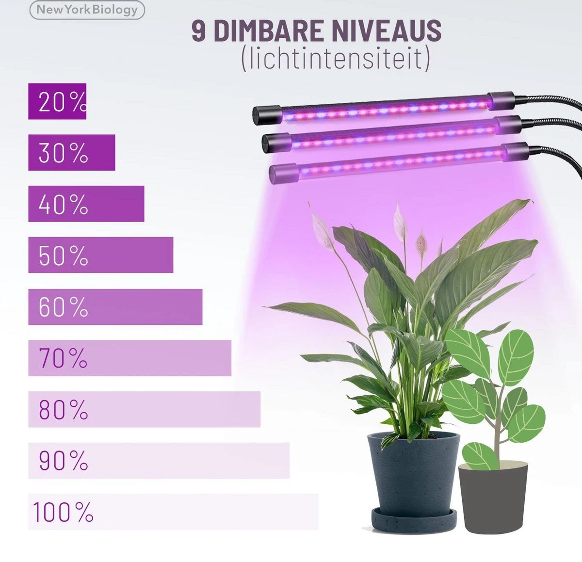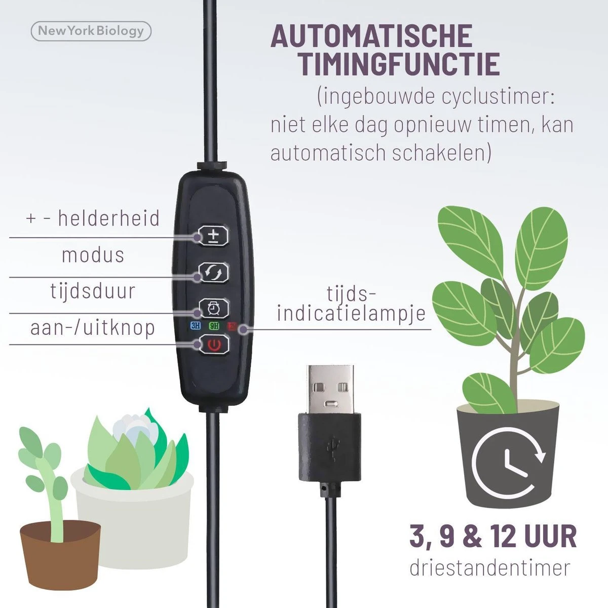 De lamp beschikt over een automatische timer, zodat u er geen omkijken naar heeft. U kunt de timer instellen op drie, negen of twaalf uur. De sterkte van het licht kan worden ingesteld op vijf verschillende niveaus, zodat u elke plant in elk stadium van de groei of bloei het licht kunt geven dat het nodig heeft.