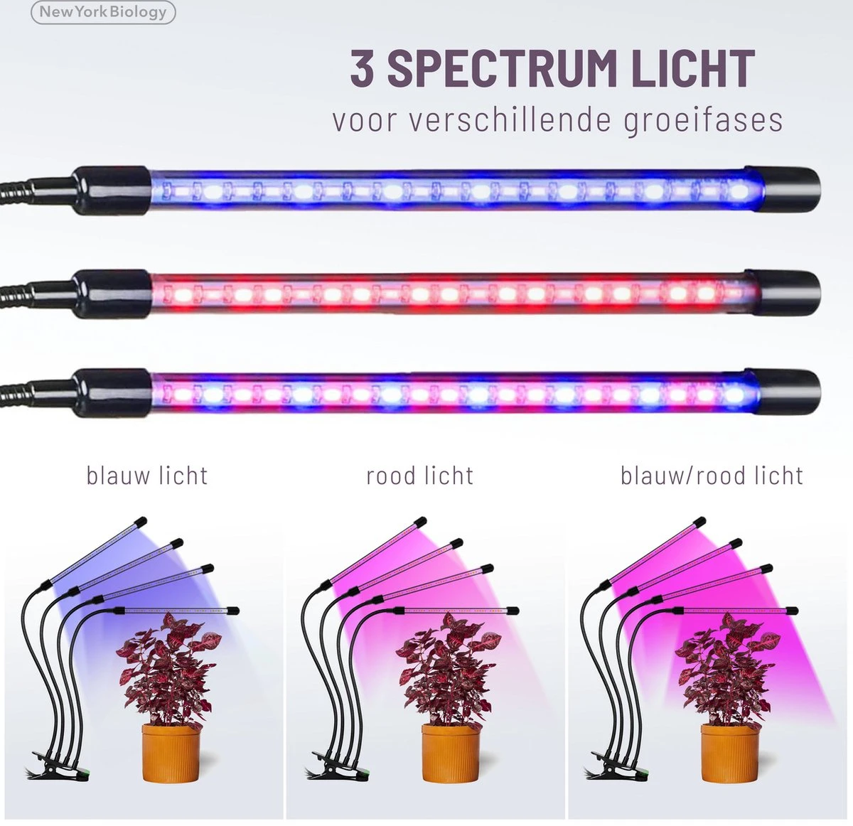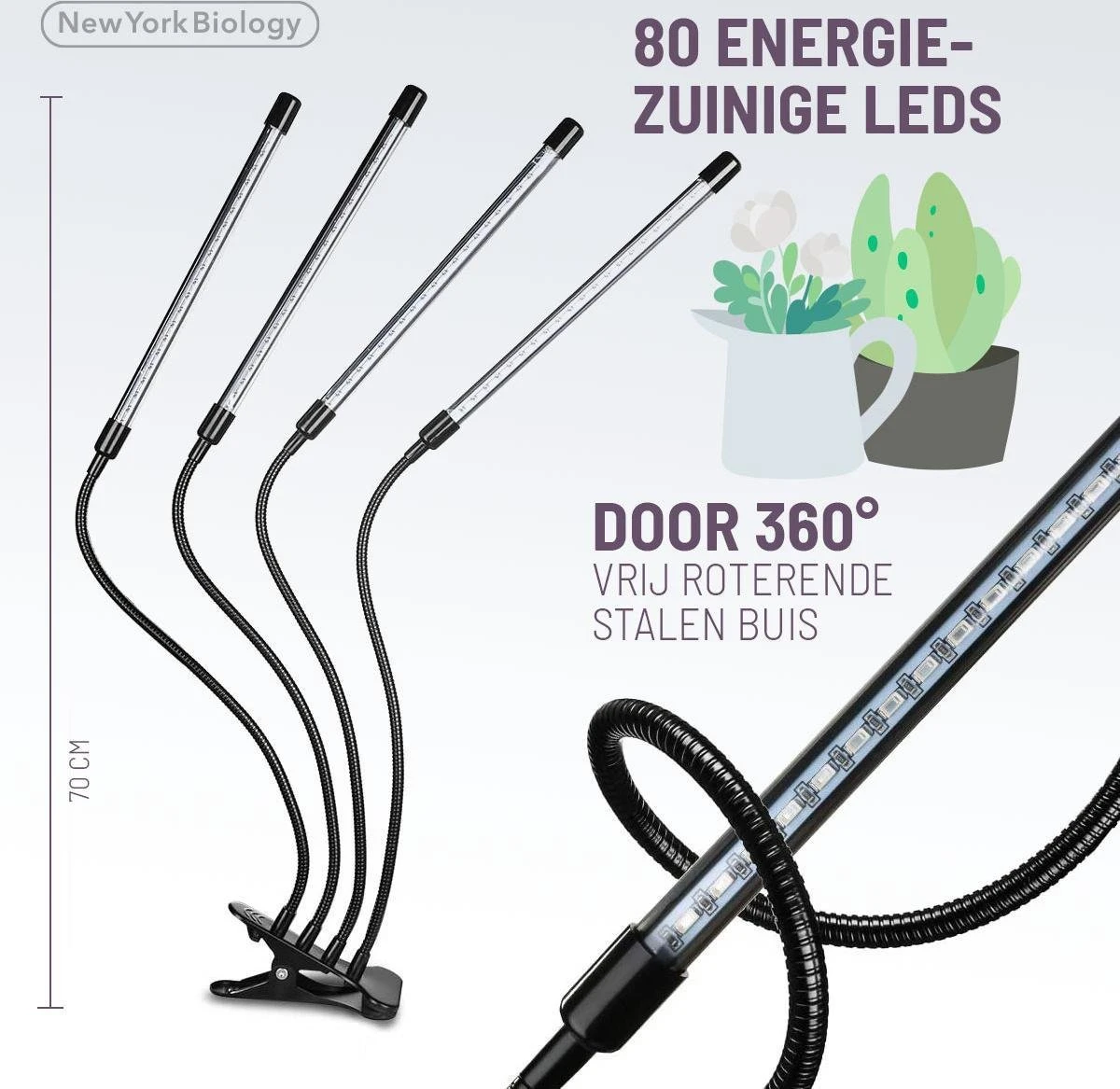 Deze groeilamp bestaat uit vier armen met in totaal 80 efficiënte en energiezuinige LEDs (52 rode en 28 blauwe). Met deze lamp groeien uw planten op plekken waar geen zonlicht is. Het rode licht bevordert de fotosynthese, ontkieming, bloei en vruchtontwikkeling. Het blauwe licht zorgt voor cholorofylsynthese waardoor de planten meer energie opnemen en beter kunnen ontkiemen.