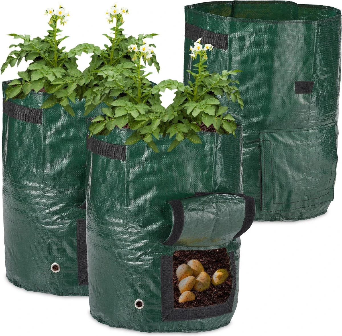 Deze plantenzak in handige set van 3 is ideaal om verschillende soorten groenten aan te bouwen. De aardappel kweekzak is voorzien van een kijkvenster met klittenbandsluiting, waarmee je in een oogopslag kan controleren hoe rijp je aardappelen, radijsjes, wortelen of tomaten zijn. Bij niet-gebruik kan je de groeizak gewoon opvouwen en ruimtebesparend opbergen.