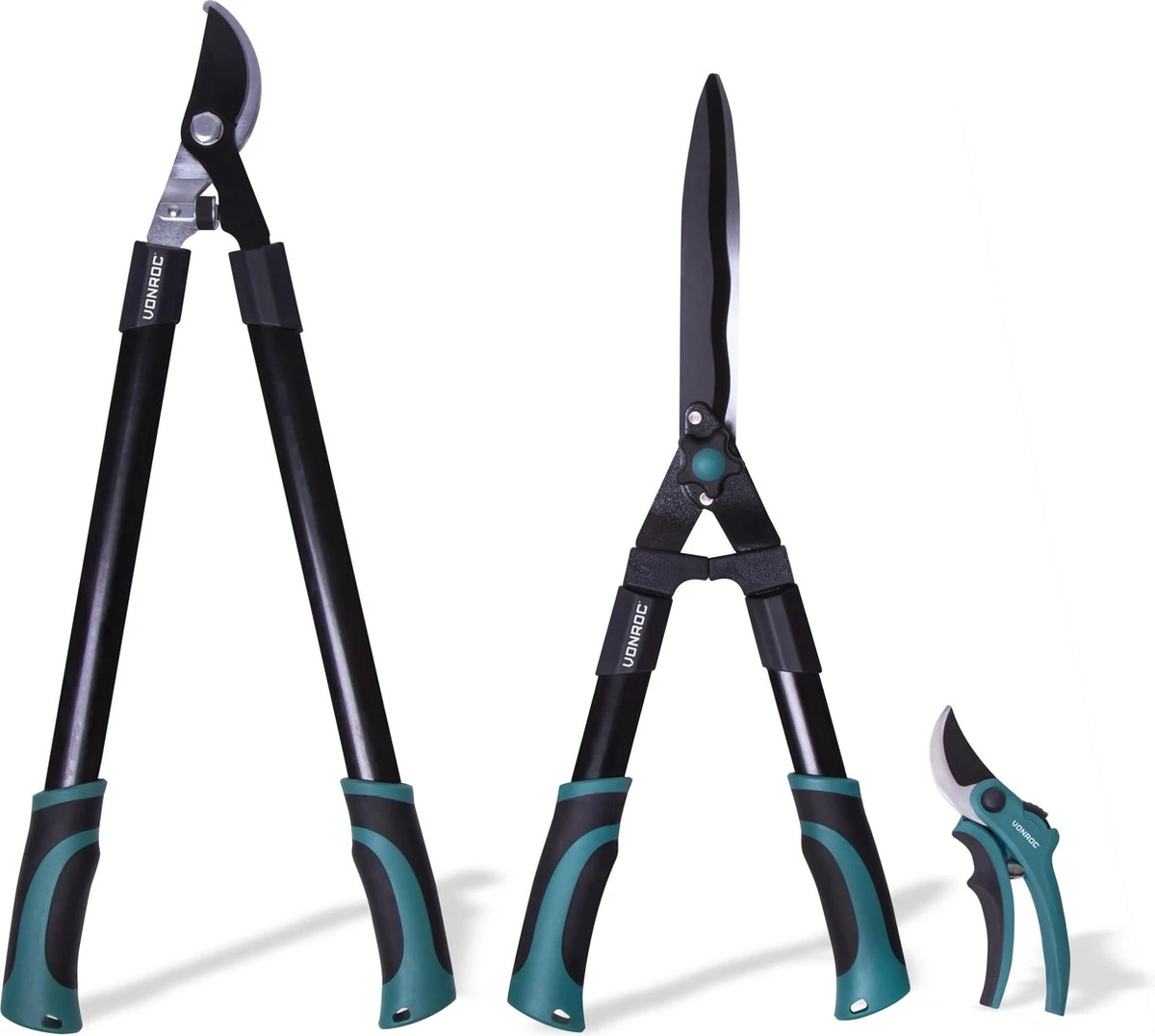 Met deze snoeiset van VONROC ga jij geen snoei- of knipklus meer uit de weg! Deze set is bedoeld voor het knippen van verse takken van heesters, struiken, sierplanten, heggen en bomen. In een mum van tijd is jouw tuin weer winter- of zomer klaar. De set bevat een takkenschaar, heggenschaar en een snoeischaar.